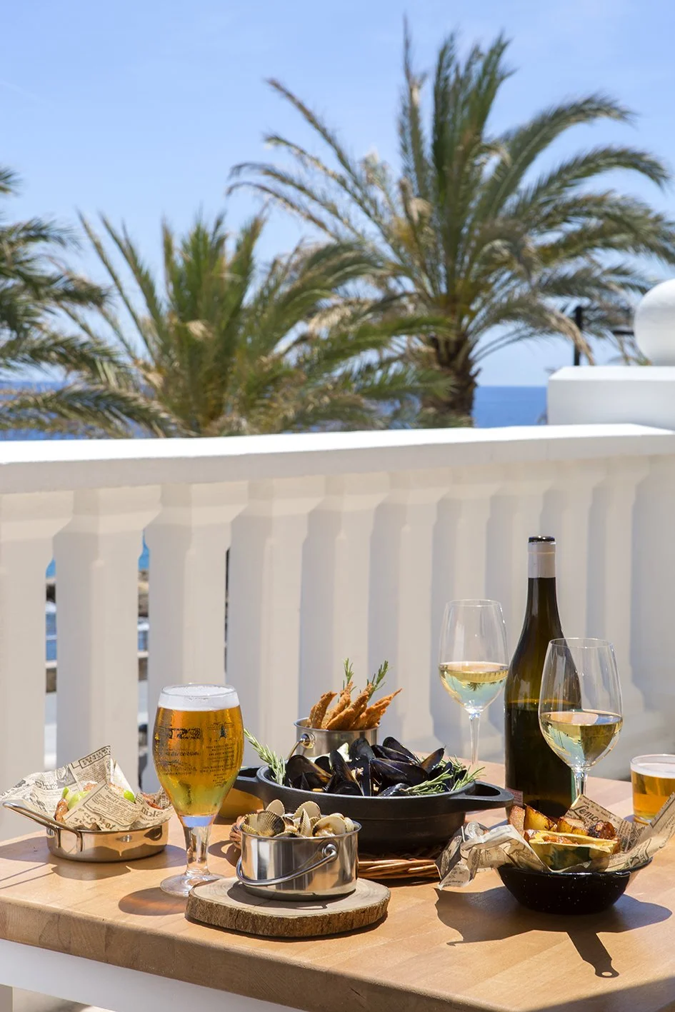 Vista del puerto con embarcaciones y edificios blancos con palmeras en la orilla, en un día soleado.